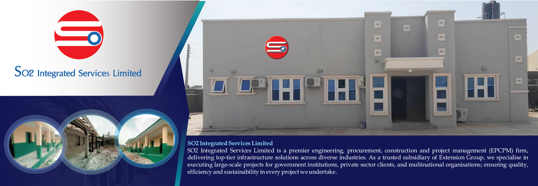 SO2 Integrated Services Limited is a premier engineering, procurement, construction and project management (EPCPM) firm, delivering top-tier infrastructure solutions across diverse industries. As a trusted subsidiary of Extension Group, we specialise in executing large-scale projects for government institutions, private sector clients, and multinational organisations; ensuring quality, efficiency and sustainability in every project we undertake.
